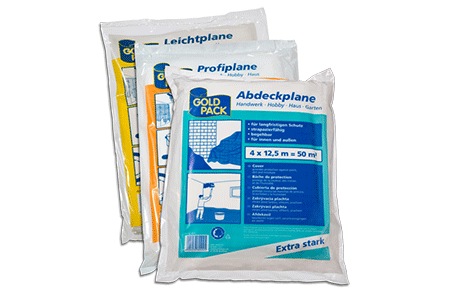 GOLDPACK Abdeckplanen schützen Gegenstände und Wände vor Feuchtigkeit und Staub. Unser vielseitiges Sortiment mit unterschiedlichen Materialen und Stärken bietet einen optimalen Schutz für jeden Anwendungsbedarf. Von Leichtplanen für kurzzeitigen Schutz, über Profiplanen mit höherer Durchstoßfestigkeit bis hin zu dicken Bauplanen zum langfristigen Abdecken haben wir das für Sie passende Produkt.