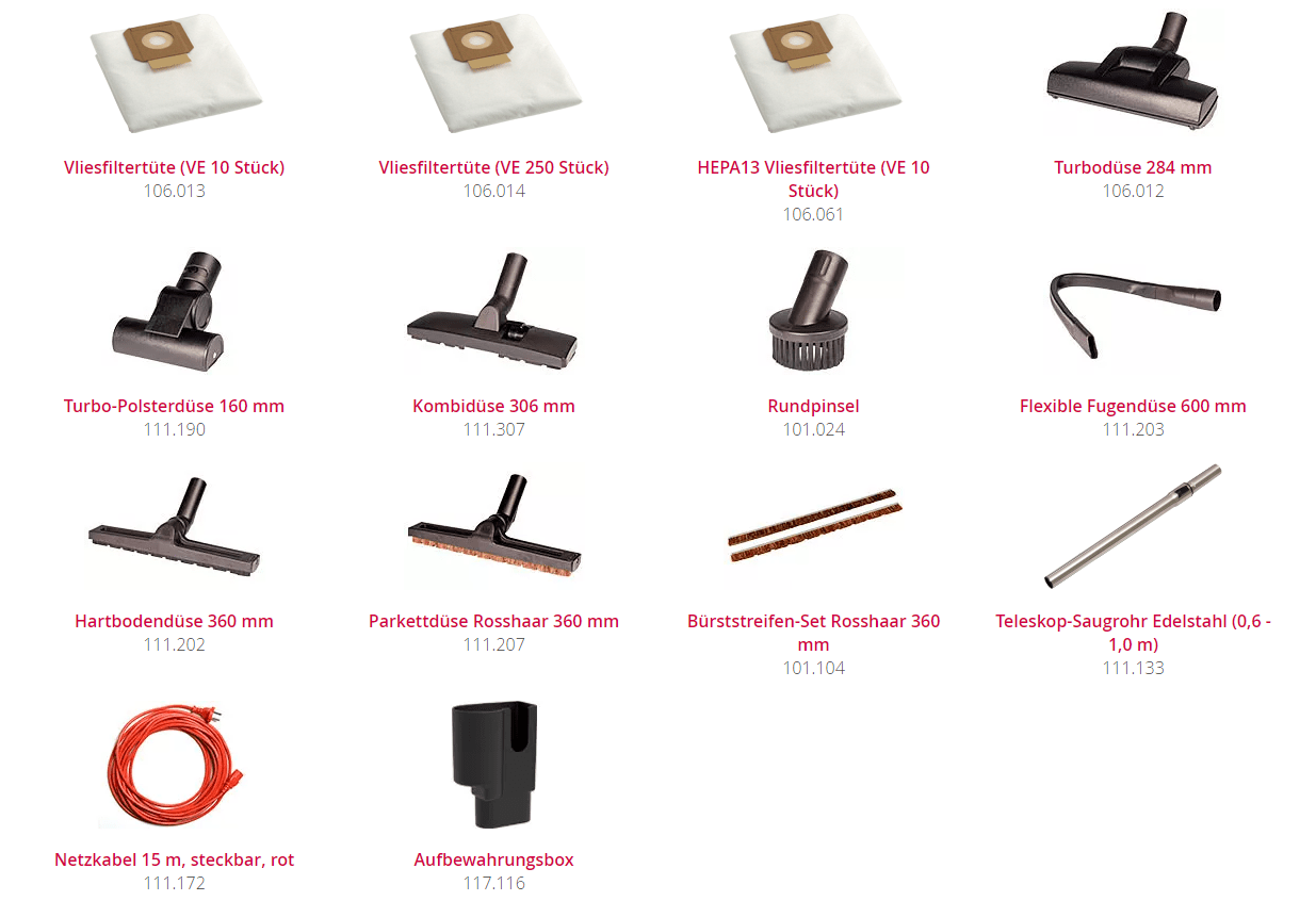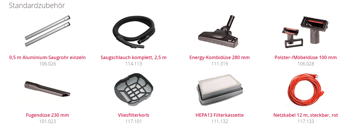 inkl. 2 x Aluminium-Saugrohre, Saugschlauch 2,0 m, Vliesfilterkorb, HEPA13 Vliesfiltertüte, HEPA13 Filterkassette, Fugendüse, kombinierte Polster- / Möbeldüse, Kombidüse 280 mm, Netzkabel 10 m, steckbar, signalrot