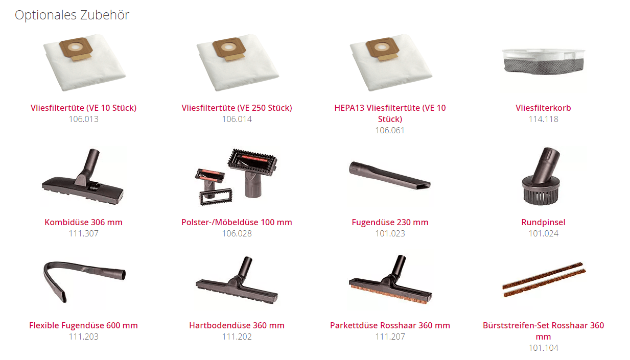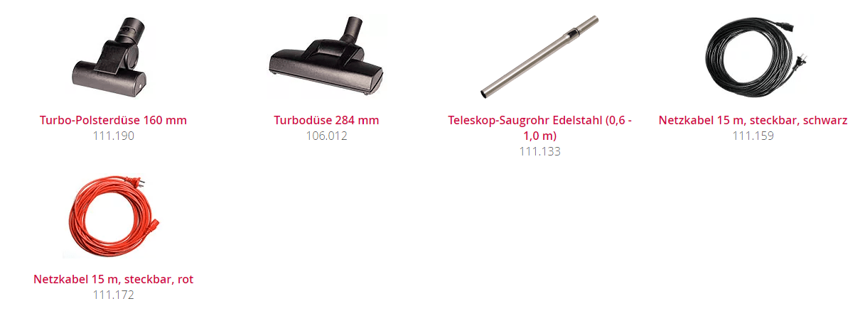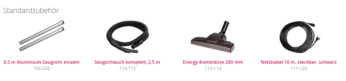 inkl. 2 x Aluminium-Saugrohre ø 32 mm, 2 m langer trittfester Multiflex-Saugschlauch, 1 x HEPA13 Vliesfiltertüte, Energy-Kombidüse 280 mm und schwarzes, steckbares 10 m Netzkabel