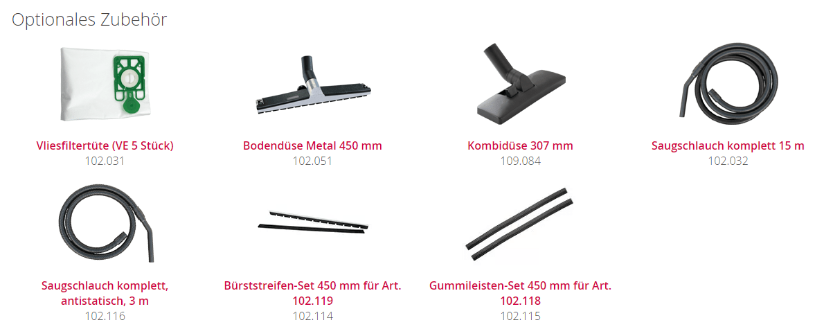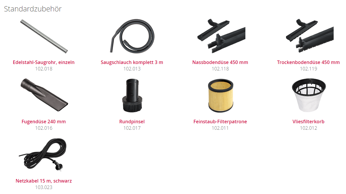 2 x 0,5 m Edelstahl-Saugrohre ø 38 mm, 3 m Saugschlauch, Fugendüse und Rundpinsel, Nassbodendüse 450 mm mit tauschbaren Gummileisten, Trockenbodendüse 450 mm mit tauschbaren Bürststreifen, Feinstaub-Filterpatrone, Vliesfilterkorb und Vliesfiltertüte, Edelstahl Tragegriffe und Schubbügel, Metall-Lenkrollen, Schmutzwasser-Ablassschlauch und 15 m Netzkabel