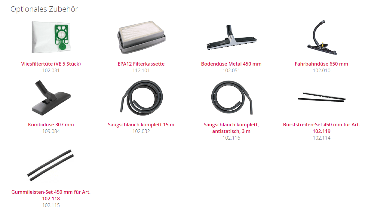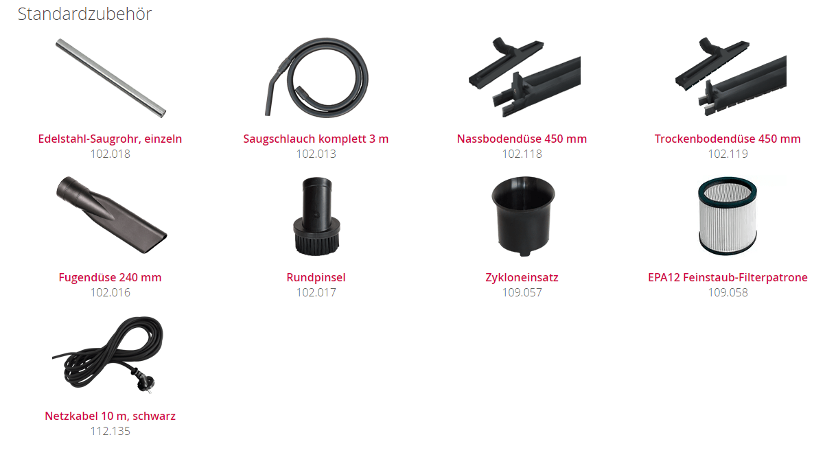 2 x 0,5 m Edelstahl-Saugrohre ø 38 mm, 3 m Saugschlauch, Fugendüse und Rundpinsel, Nassbodendüse 450 mm mit tauschbaren Gummileisten, Trockenbodendüse 450 mm mit tauschbaren Bürststreifen, EPA12 Feinstaub-Filterpatrone, Vliesfiltertüte, Zykloneinsatz, 10 m Netzkabel