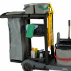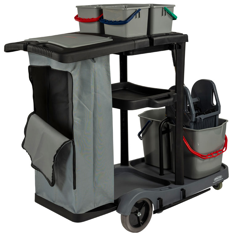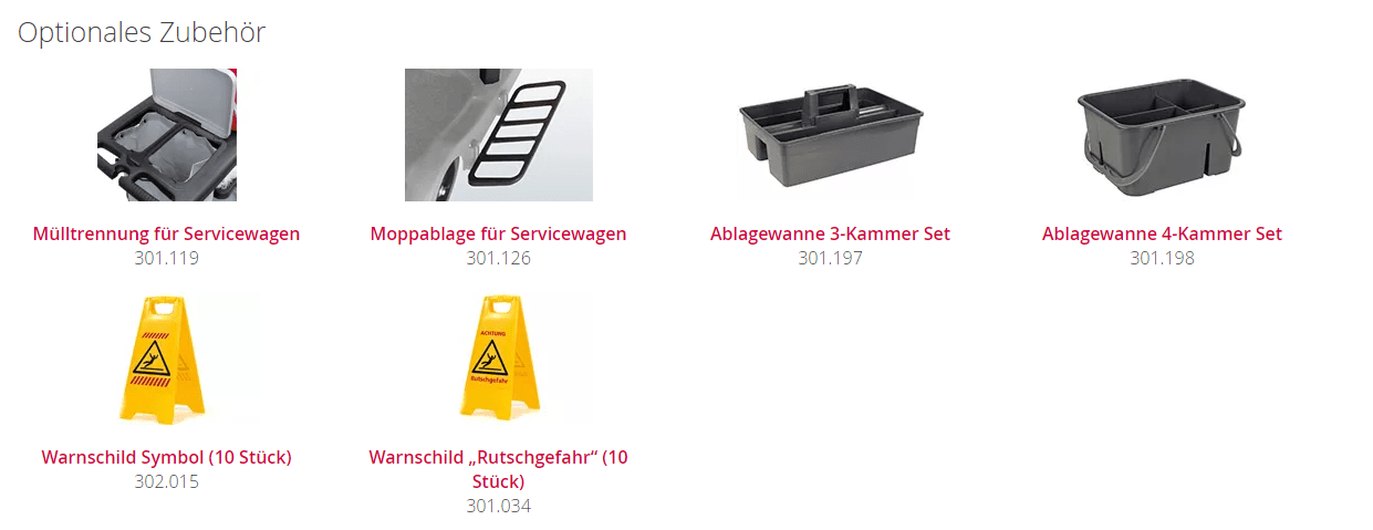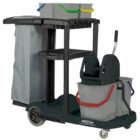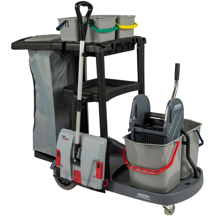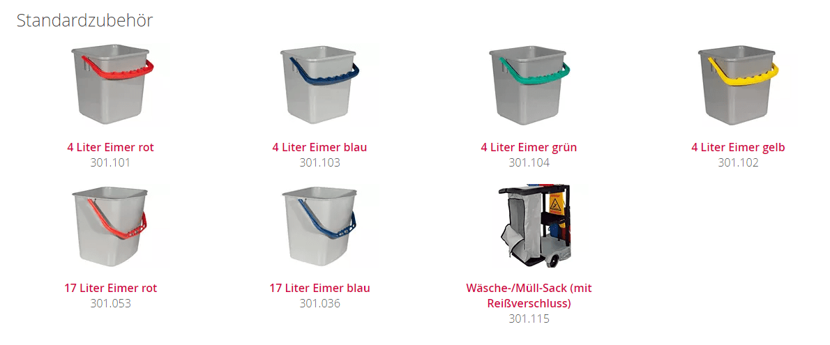 4 x 4 Liter Eimer rot, blau, grün und gelb, 2 x 17 Liter Eimer rot und blau, Mopp-Presse, Seitliche Ablagen für Mopp oder Besen, Wäsche- / Müllsack mit Reißverschluss